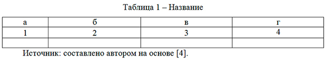 Если таблица или рисунок разработаны самостоятельно автором, следует использовать следующий вариант оформления ссылок. Под таблицей/названием рисунка пишем: «Источник: Составлено или разработано автором». Или: «Источник: Составлено или разработано автором на основе данных [2]».